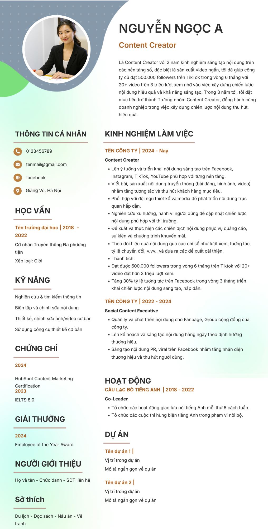 Vị trí Content Creator là vị trí linh hoạt, đòi hỏi sự am hiểu sâu sắc về hành vi khán giả và khả năng sản xuất nội dung chất lượng cao trên nhiều định dạng. CV của bạn phải là một bằng chứng rõ ràng về khả năng kể chuyện và tạo ra kết quả có thể đo lường được.