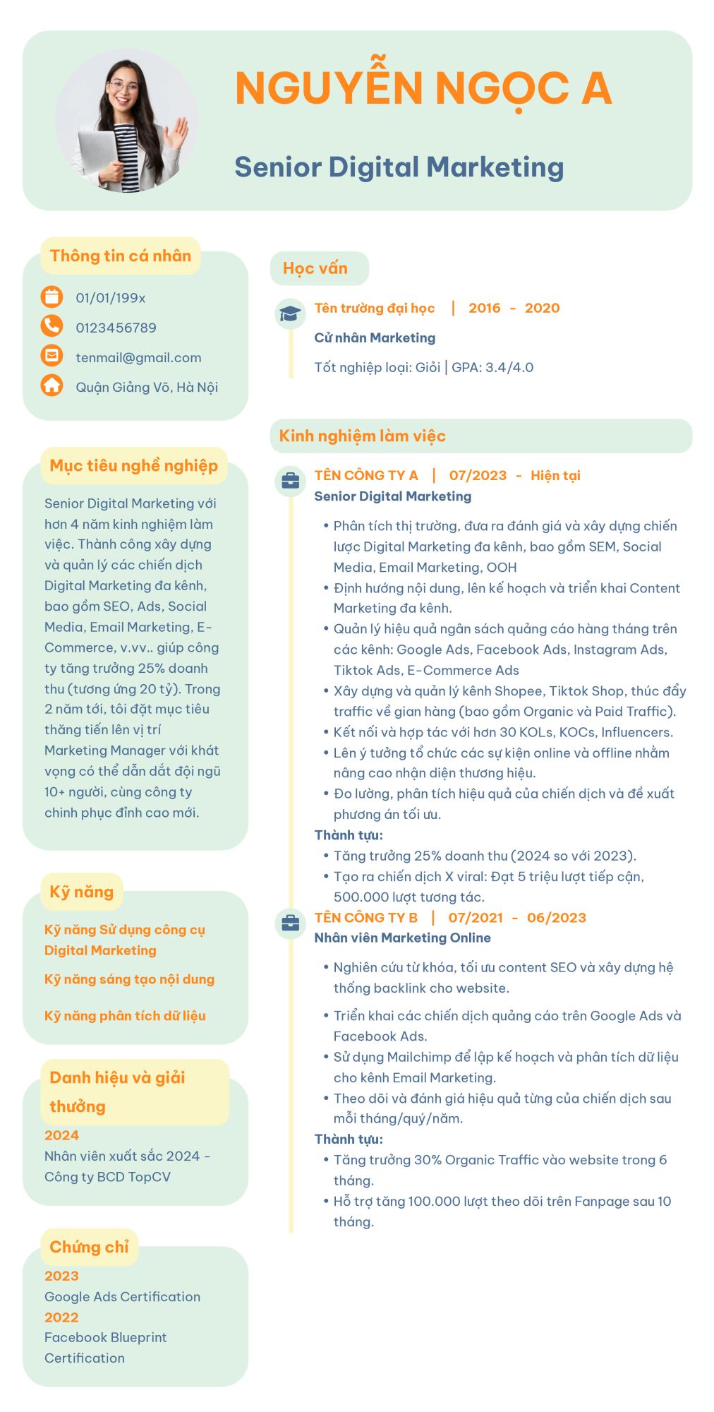 • Tính hiệu suất: Nhà tuyển dụng không chỉ muốn biết bạn đã làm gì, mà là bạn đã đạt được kết quả gì và bằng cách nào. Mọi kinh nghiệm đều phải được gắn với số liệu cụ thể và KPI. Ví dụ: Thay vì nói "Quản lý Fanpage", hãy viết "Tăng trưởng traffic/Conversion Rate/Engagement lên X% trong Y tháng."